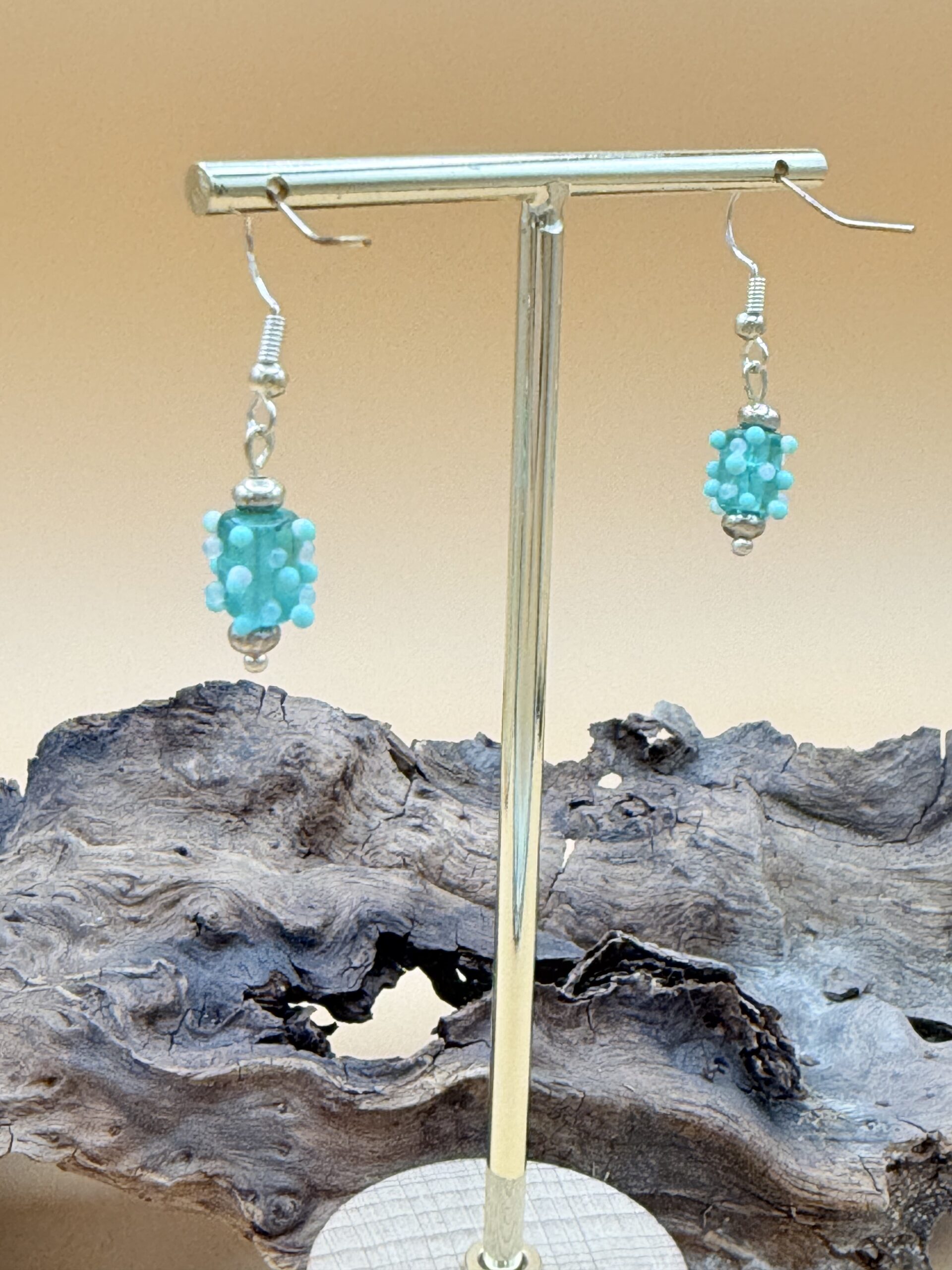 Façonnées à la flamme dans mon atelier, ces boucles sont montées entre deux perles en argent 925, sur des crochets en argent 925.