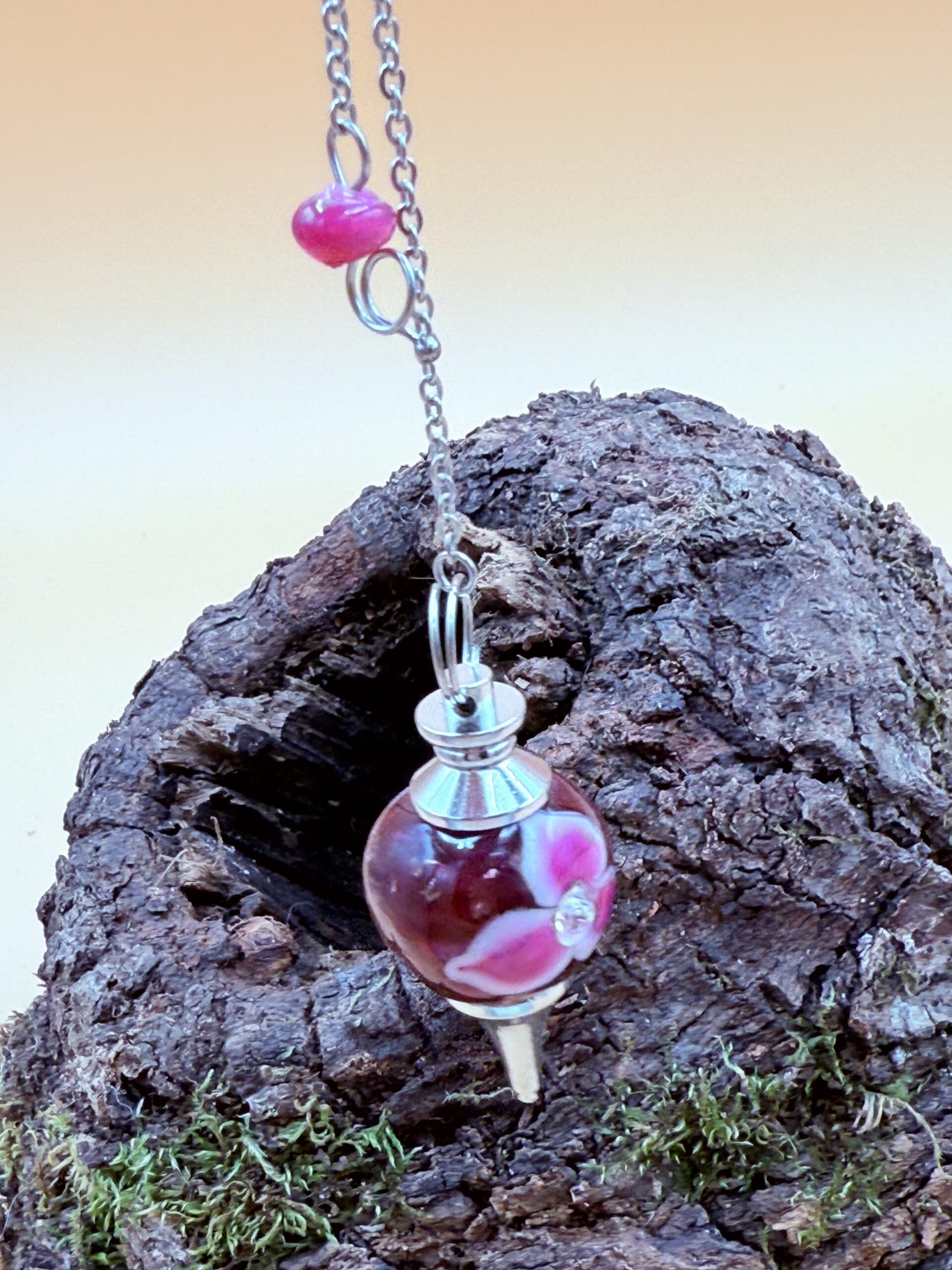 Ce pendule est agrémenté d’une toute petite perle assortie en verre de Murano, le tout sur une chaîne en acier inoxydable.